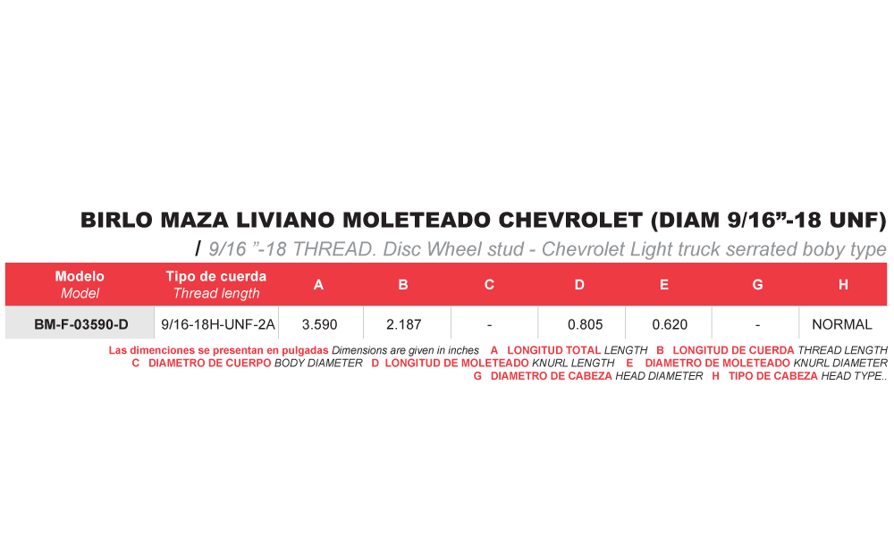 BIRLO MAZA LIVIANO MOLETEADO CHEVROLET (DIAM 9/16”-18 UNF)