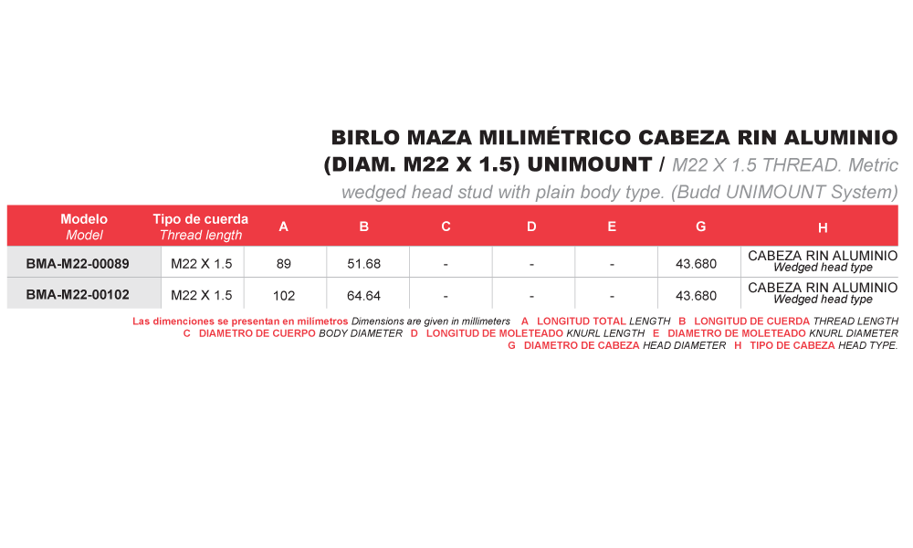 Sé el primero en valorar “BIRLO MAZA MILIMÉTRICO CABEZA RIN ALUMINIO (DIAM. M22 X 1.5) UNIMOUNT” Cancelar la respuesta