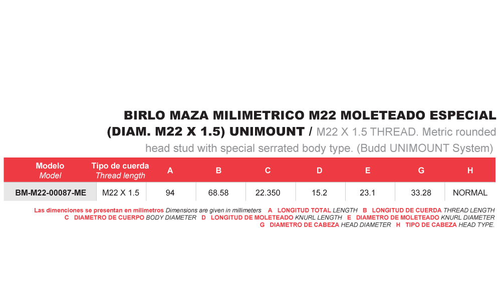 BIRLO MAZA MILIMETRICO M22 MOLETEADO ESPECIAL (DIAM. M22 X 1.5) UNIMOUNT