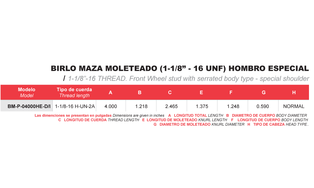BIRLO MAZA MOLETEADO (1-1/8” – 16 UNF) HOMBRO ESPECIAL