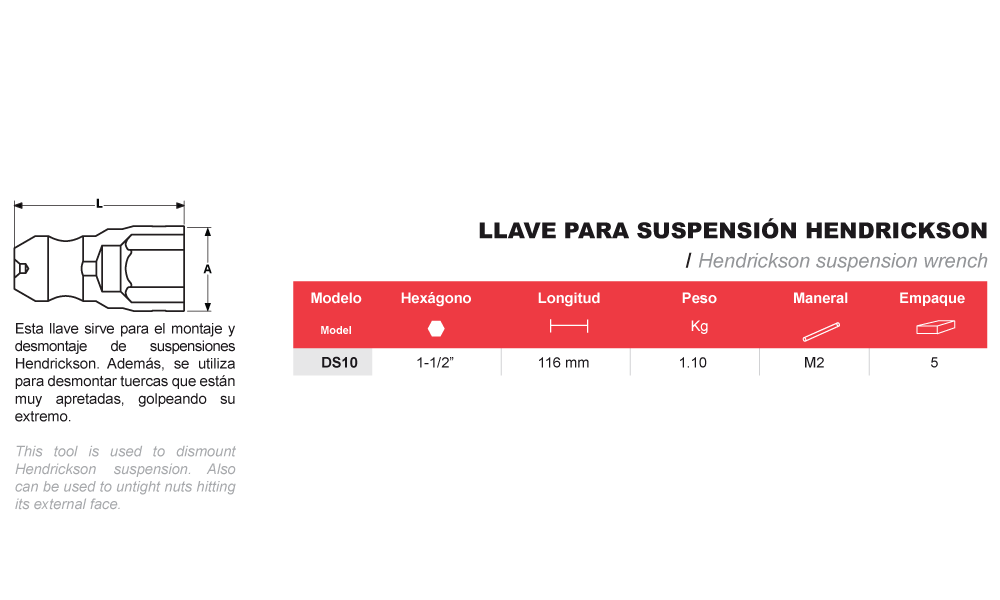 Esta llave sirve para el montaje y desmontaje de suspensiones Hendrickson. Además, se utiliza para desmontar tuercas que están muy apretadas, golpeando su extremo.