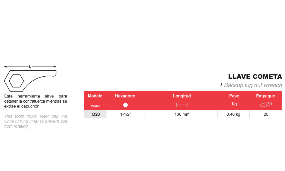 | Size | Esta herramienta sirve para detener la contratuerca mientras se extrae el capuchón. This tools holds outer cap nut while turning inner to prevent bolt from rotating. |
