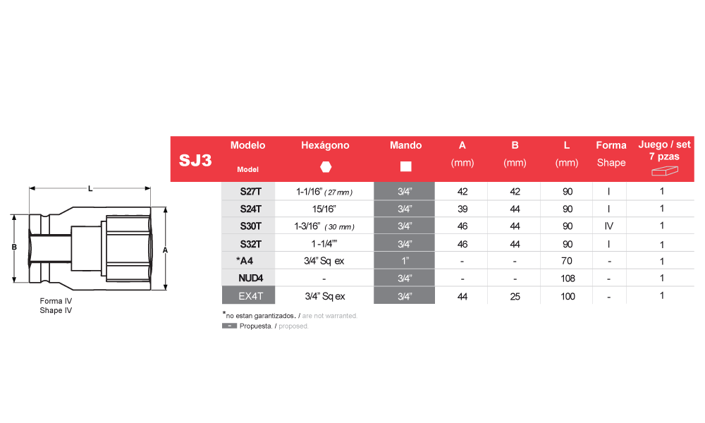 JUEGOS DE 4 DADOS DE IMPACTO LARGOS HEXAGONALES PARA CAMBIO DE RUEDAS, ADAPTADOR Y NUDO SJ3.