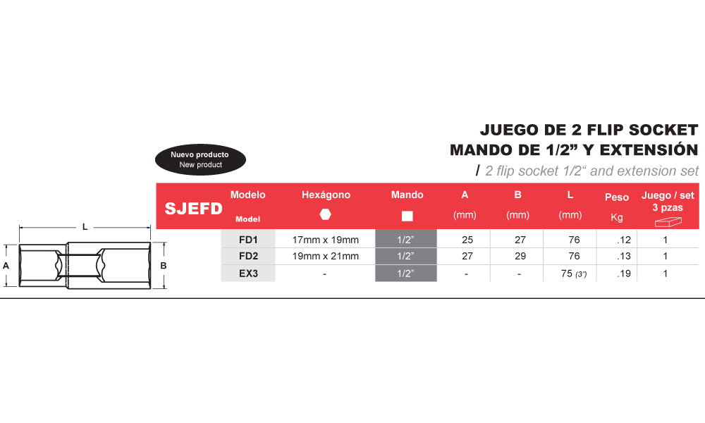 JUEGO DE 2 FLIP SOCKET MANDO DE 1/2” Y EXTENSIÓN