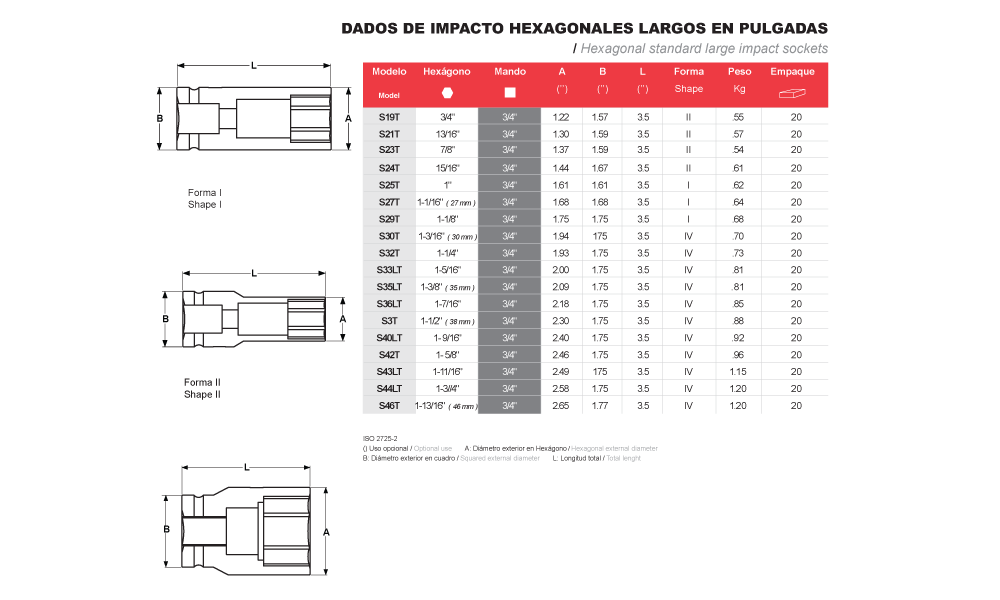 DADOS DE IMPACTO HEXAGONALES LARGOS EN PULGADAS / Hexagonal standard large impact sockets